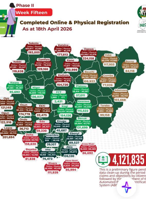 At the conclusion of the CVR second phase, Fresh data on nationwide registration has revealed strong grassroots participation across several states, with Kano State, Niger State and Katsina State emerging as top performers in physical registration.